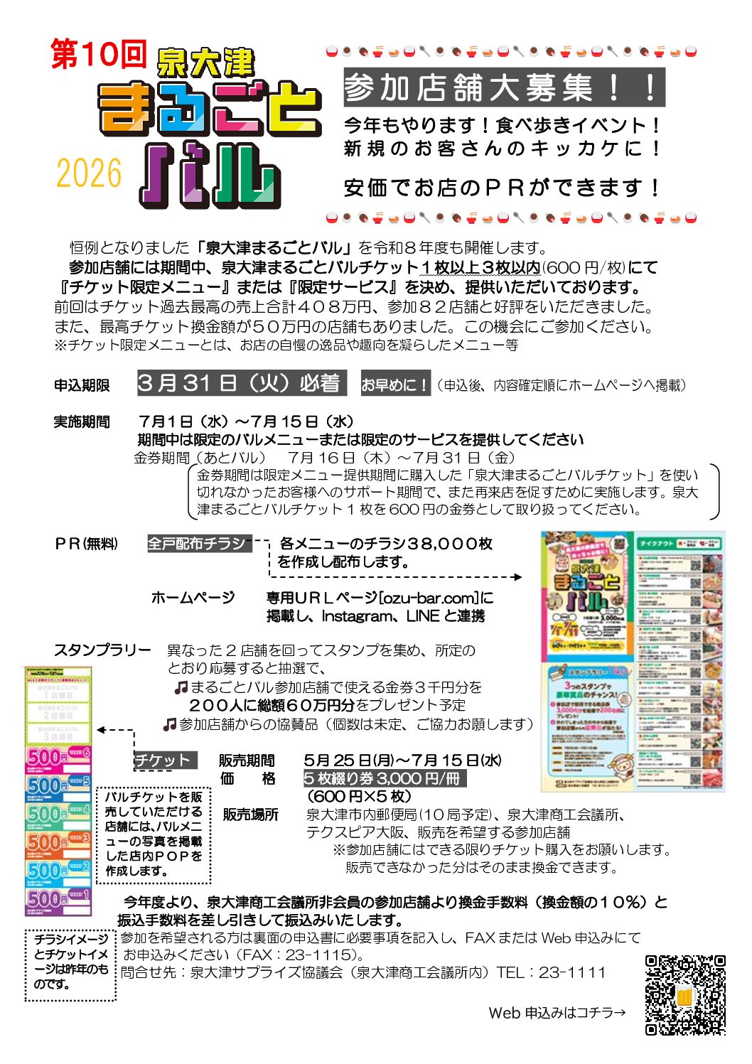 第10回 泉大津まるごとバル開催決定!参加店舗大募集!2026年02月09日